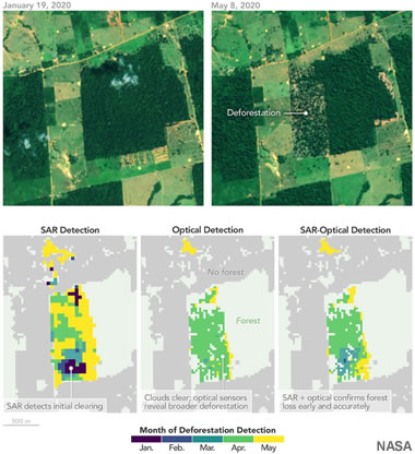 According to the United Nations Environment Programme, an average of 10 million hectacres of tropical forests are lost each year - that's an area about the size of Kentucky. To help stop unregulated forest clearing in the Brazilian Amazon, scientists at NASA have developed a new method of monitoring that combines traditional satellite imagery with radar data. The radar can "see" through cloud cover to detect deforestation in its early stages, before extensive damage has occurred. NASA Earth Observatory images by Michala Garrison, using MODIS data from NASA EOSDIS LANCE and GIBS/Worldview, the Harmonized Landsat and Sentinel-2 (HLS) product, and model data provided by Flores-Anderson et al.
